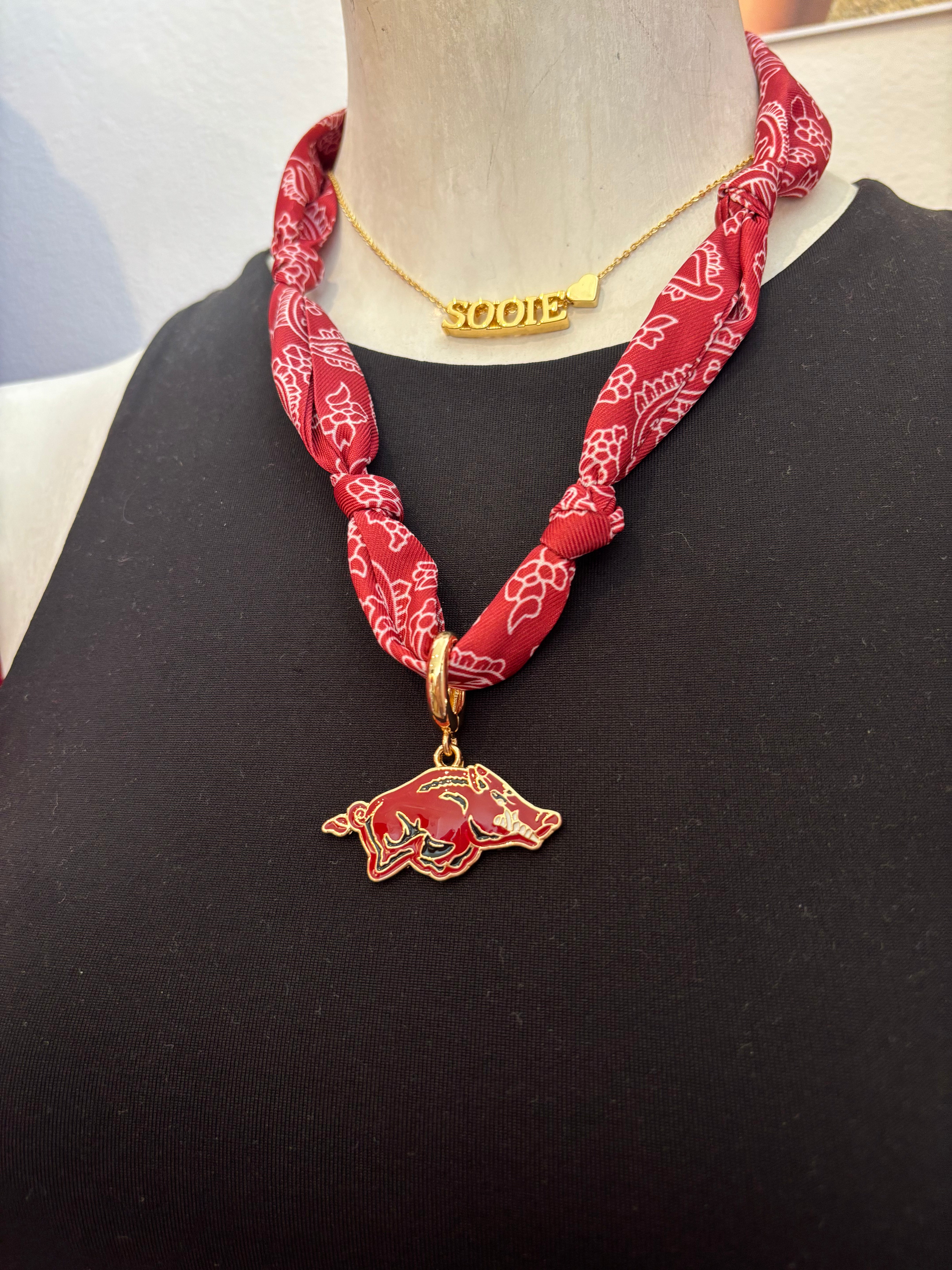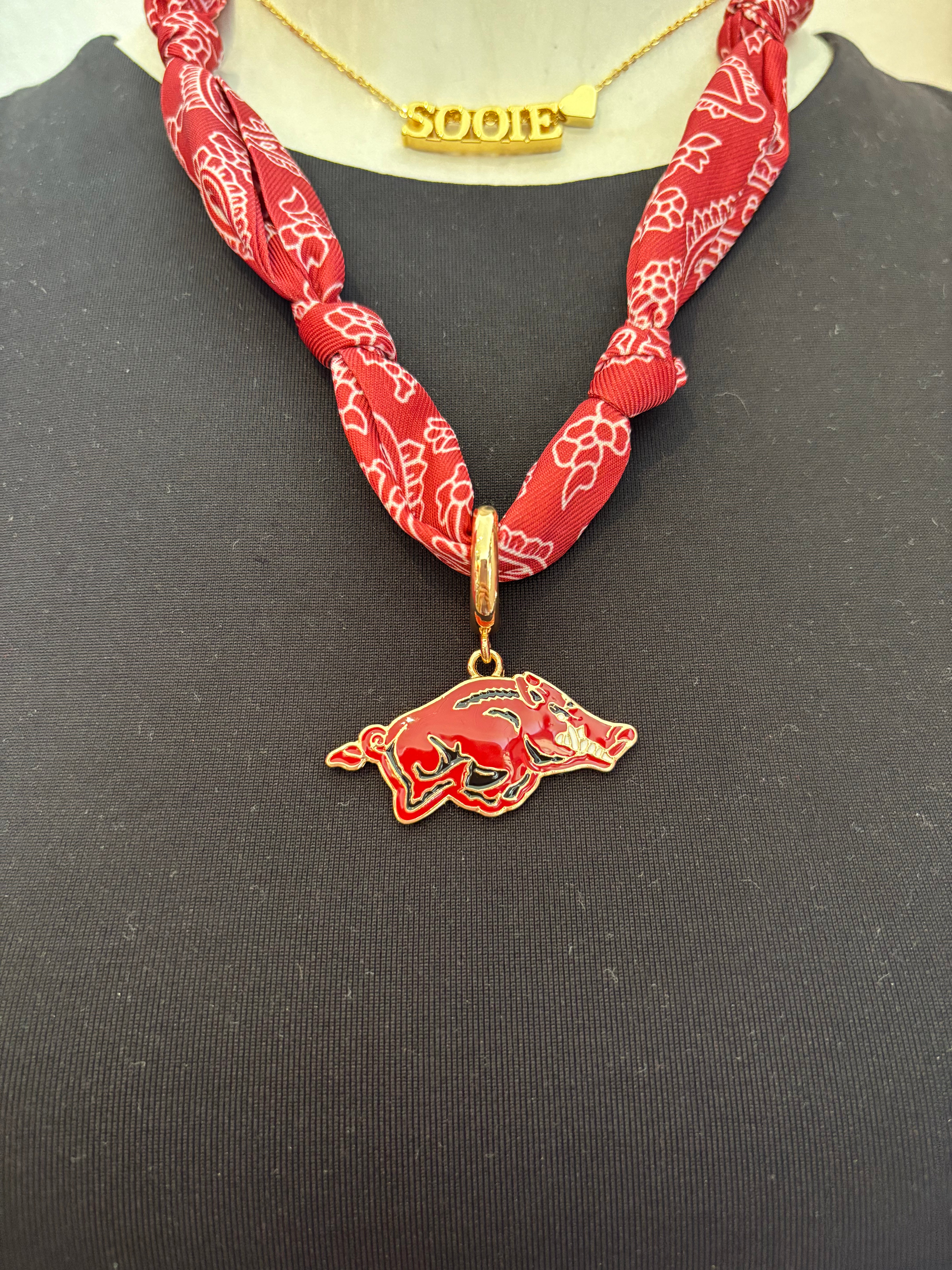 Wooo Pig Sooie never looked so stylish. This preppy scarf necklace adds flair to your Razorbacks spirit.