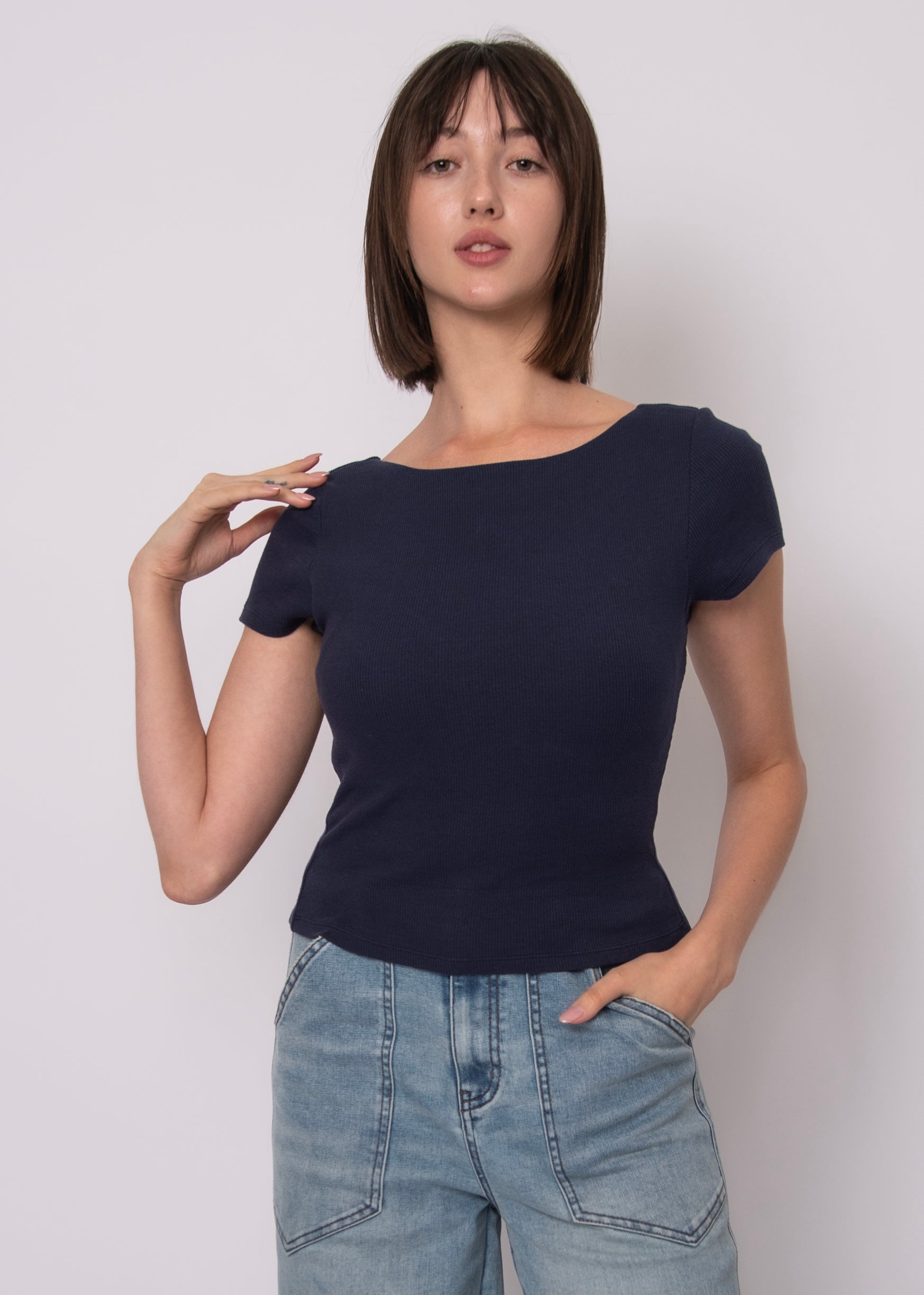 Navy blue ribbed top with deep scoop back. Built in bra and cap sleeves.