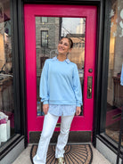 The Ladies Knitted Top is a Blouse crafted from 48% Modal, 48% Polyester, and 4% Elastane. It features a stylish layered design with a striped collar and hem, giving the illusion of a shirt beneath a sweater. Pair it with jeans or a skirt for a cool, layered look