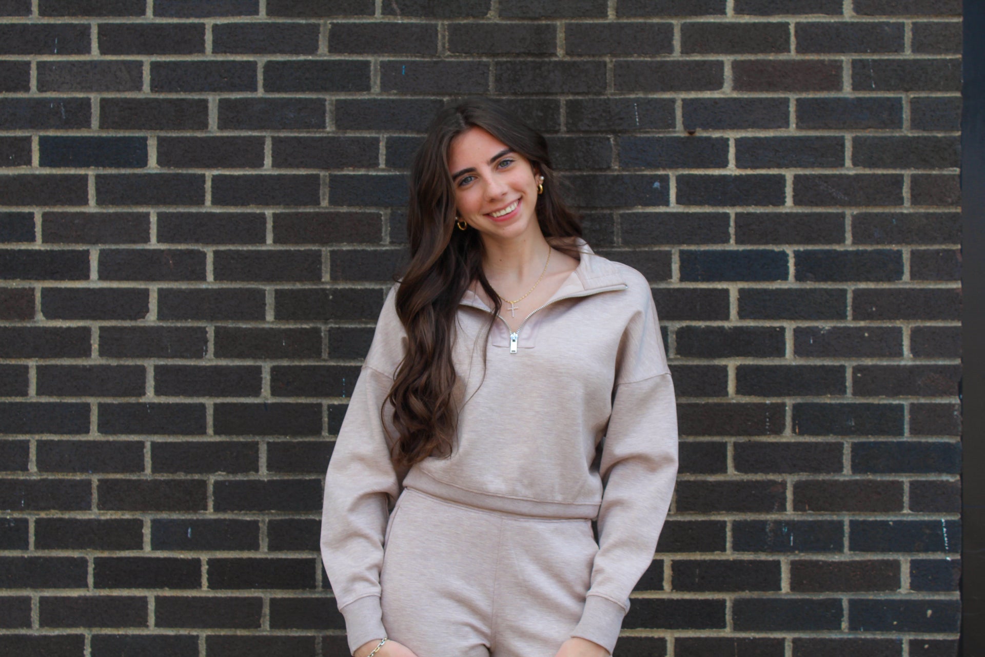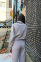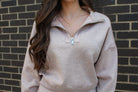 The Mailyn Mock Half Zip pullover offers a relaxed fit with exceptional softness and stretch. Ideal for both travel and leisure, it provides cozy comfort throughout the day. Featured here in Taupe, it pairs seamlessly with the coordinating "Erika" pants for a complete ensemble.