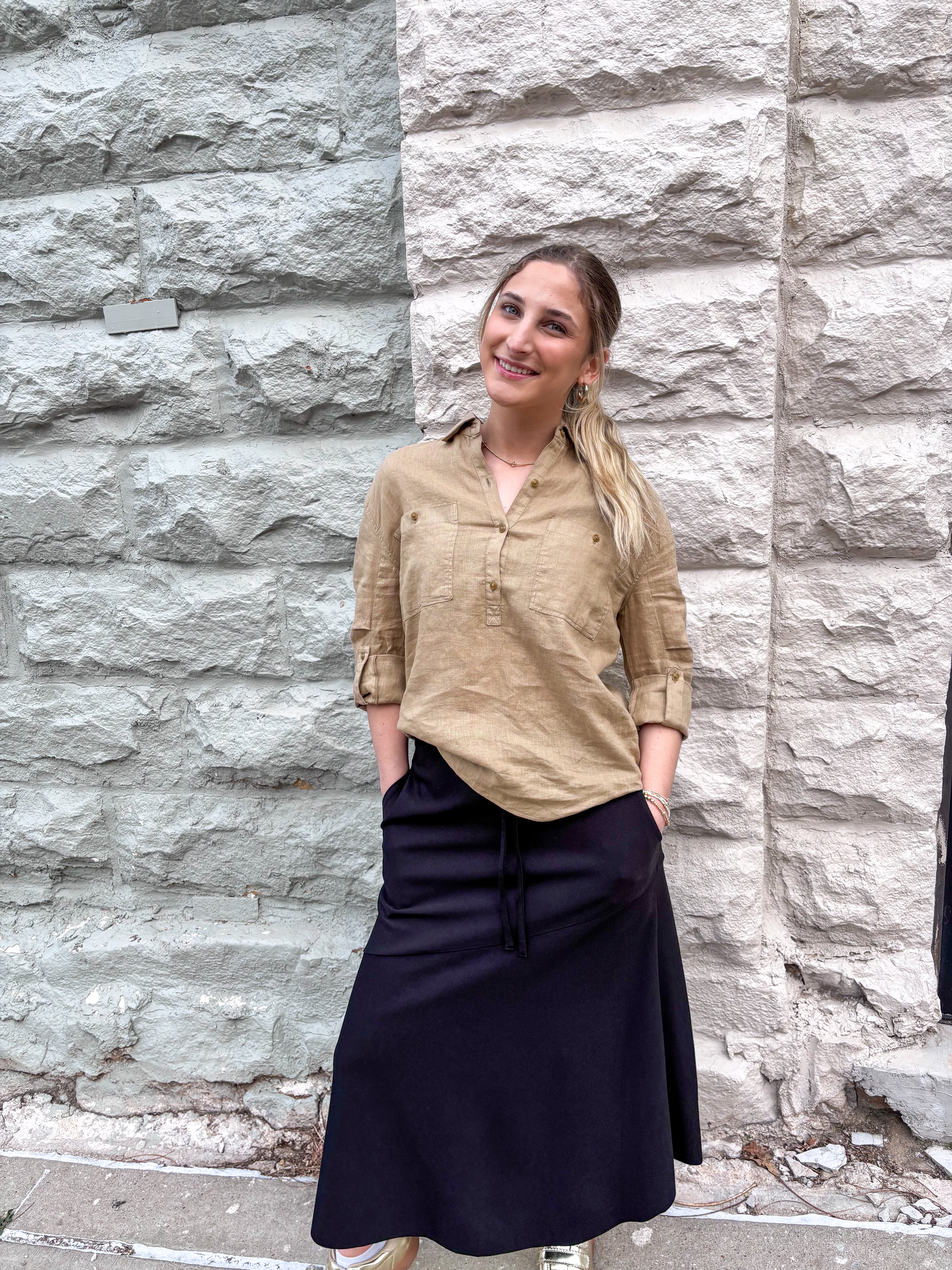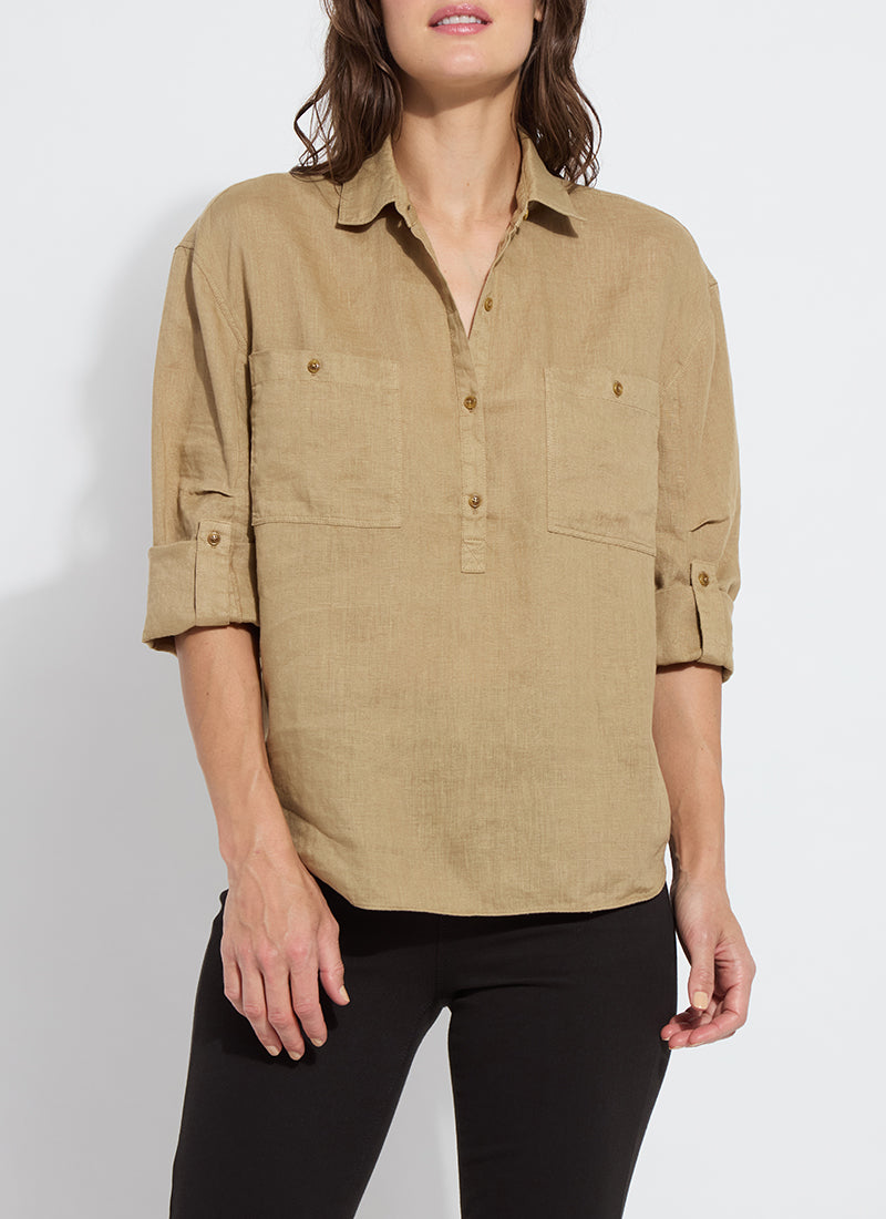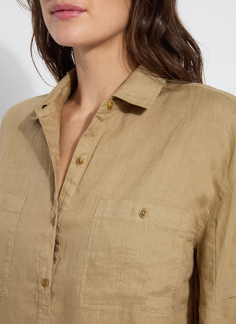 Made from garment dyed Linen Shirting that’s naturally wrinkled, the Rose Roll Tab Utility Shirt offers a true linen feel, pull-over styling, faux horn buttons, front pockets, drop shoulders and voluminous sleeves with tabs. Offering a relaxed fit, the Roe Roll Tab Utility Shirt partners beautifully with wide-leg pants and jeans, including the Erin West Utility Wide Leg Crop. Simply machine wash and hang dry to maintain its wrinkled look.
