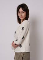 Ivory knit sweater with delicate black floral details. Scalloped edging with button front closure.