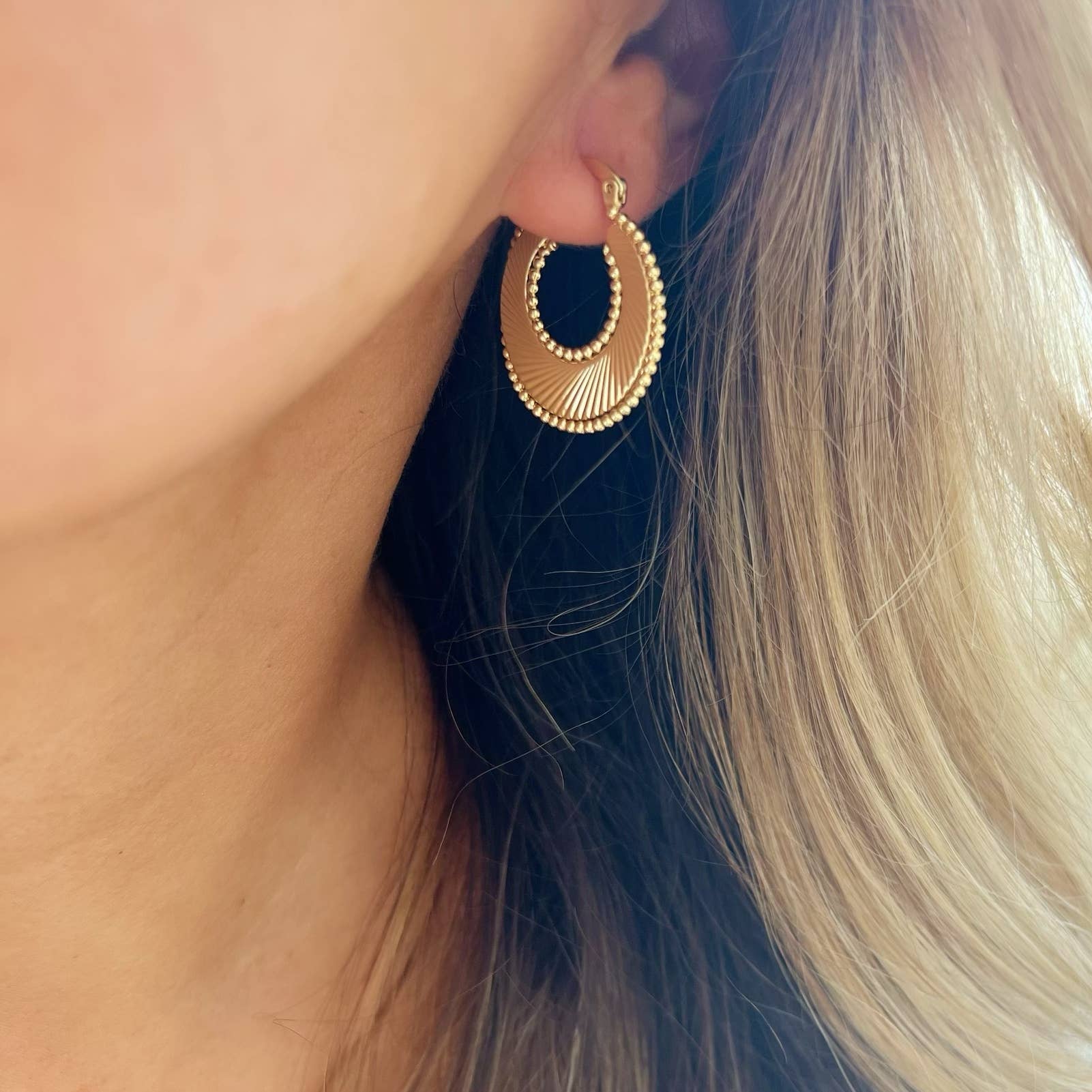 High quality 14k gold-filled hoops. Lightweight. - Size: 30mm - Hinge backing - Lead & nickel free - Hypoallergenic. JEWELRY CARE TIPS Our 14k gold filled earrings are high quality and will not tarnish, peel or rust. Gold filled jewelry can handle getting wet however, to prolong its beauty and overall longevity, here's what we recommend: 1) Put on your jewelry AFTER applying perfumes, sunscreens & lotions. Chemicals and water can shorten the lifespan of gold filled jewelry as it is not solid gold 2) Avoid wearing in pools & hot tubs 3) Clean your gold filled jewelry with a soft cloth or mild soap & water 4) Wear with confidence xoxo