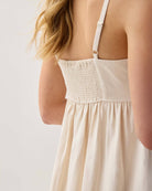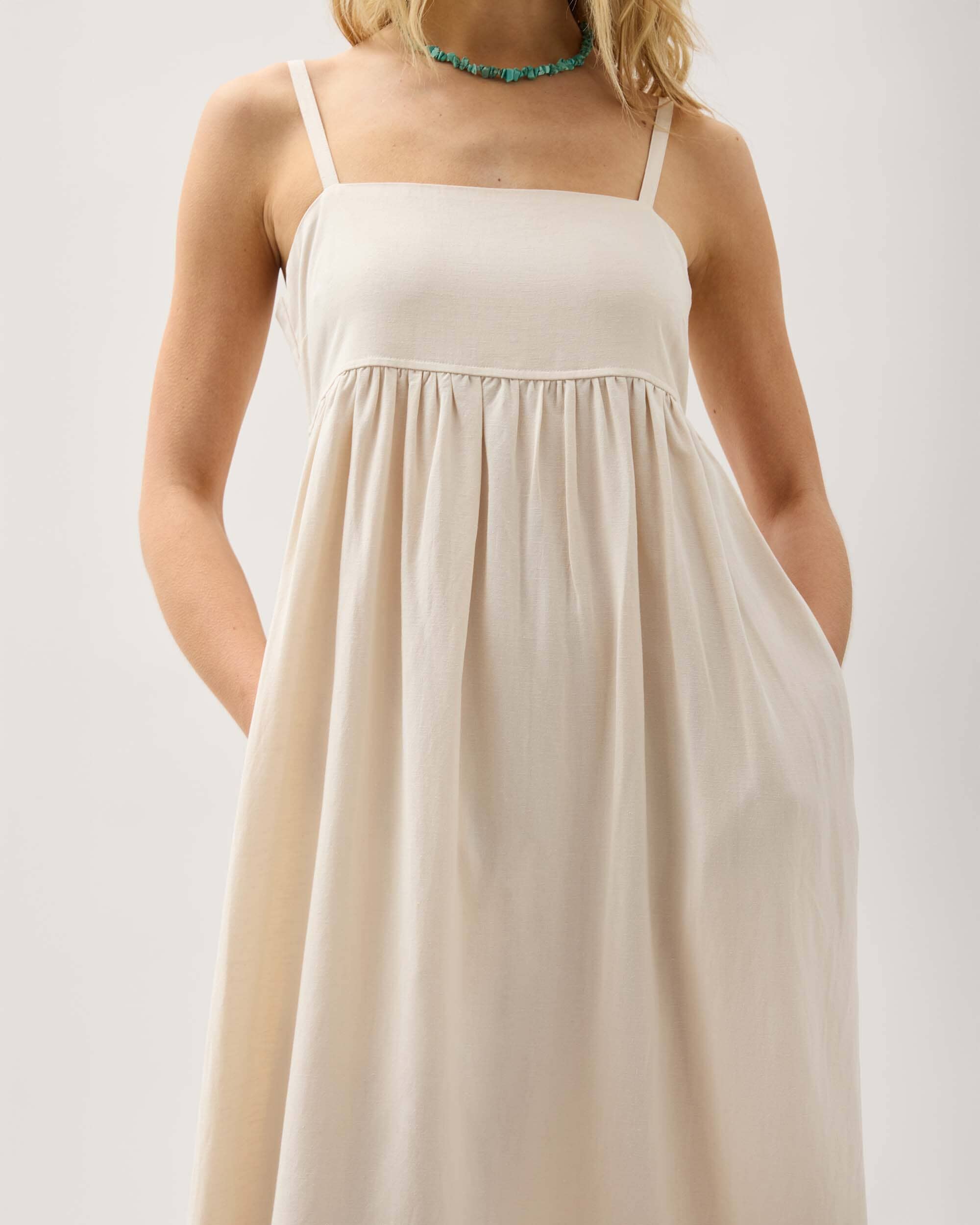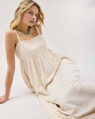 Classic Fit: True to size thru bodice, then opens up from empire waist.  Beautiful, softly structured linen-blend fabric. Easy, pull on maxi with modern babydoll styling. Stretchy smocking at back panel, and adjustable straps * On seam pockets * Size Small measures 16 ½" at chest and 15 ⅝" at waist seam (½ measurements). Length is 53 ¼" from top edge to bottom on size small