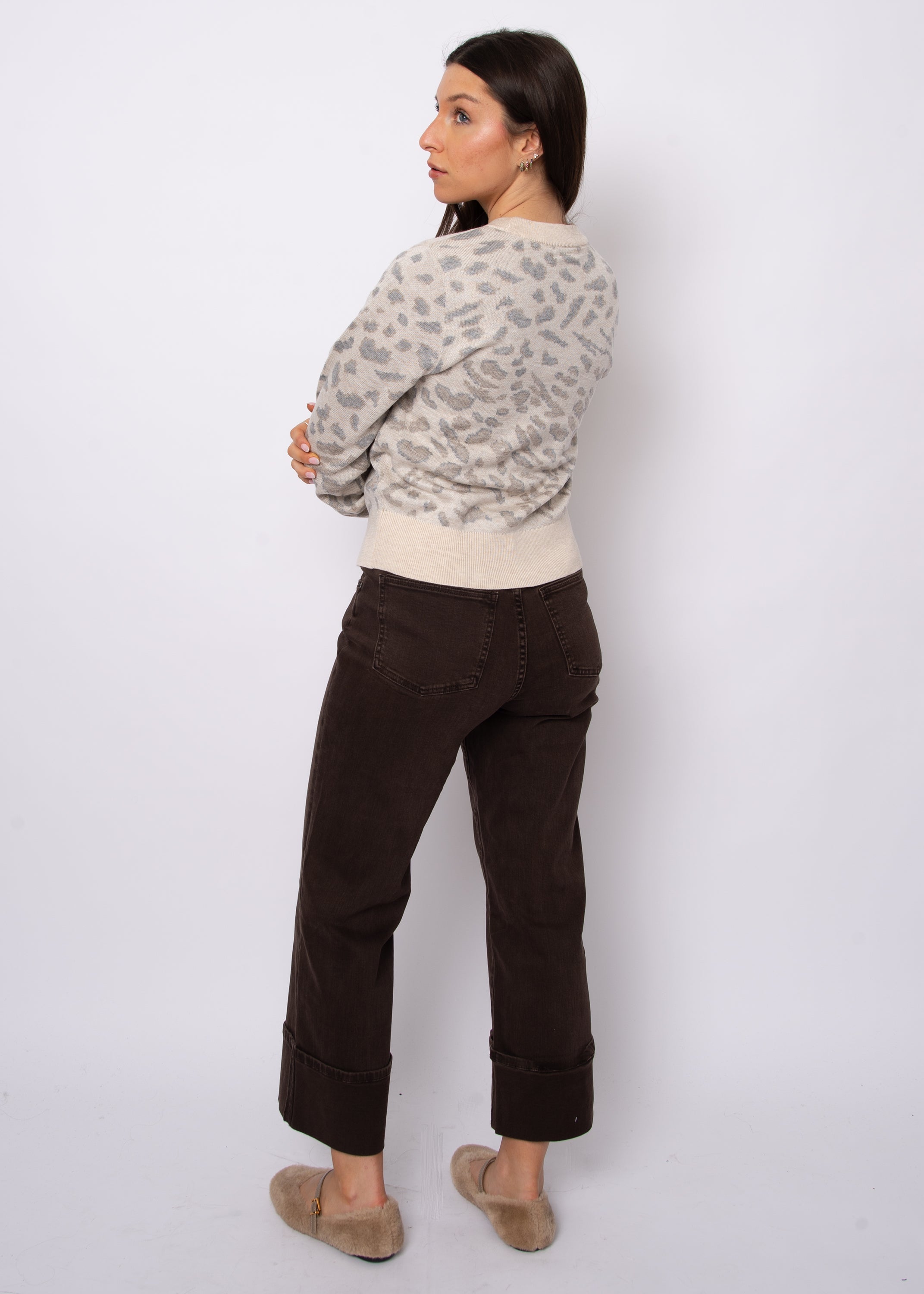 Cream knit sweater with light gray and neutral tone leopard pattern