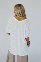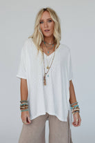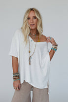 Embrace the warmth of the night in style with our versatile Warm Nights V Neck Top, whether you're enjoying a cozy evening at home or stepping out for a leisurely stroll, this top promises to be your go-to choice for relaxed boho western style! * Comfortable ribbed knit fabric with a heathered design throughout * Loose and oversized tee shirt silhouette * Flattering v-neckline with loose 3/4 length sleeves * High-low bottom edge with side lit details for added comfort and style