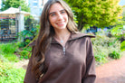 This Modal half-zip pullover offers a relaxed fit with exceptional softness and stretch. Ideal for both travel and leisure, it provides cozy comfort throughout the day. Featured here in burnt melange, it pairs seamlessly with the coordinating "Victoria" pants for a complete ensemble.
