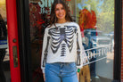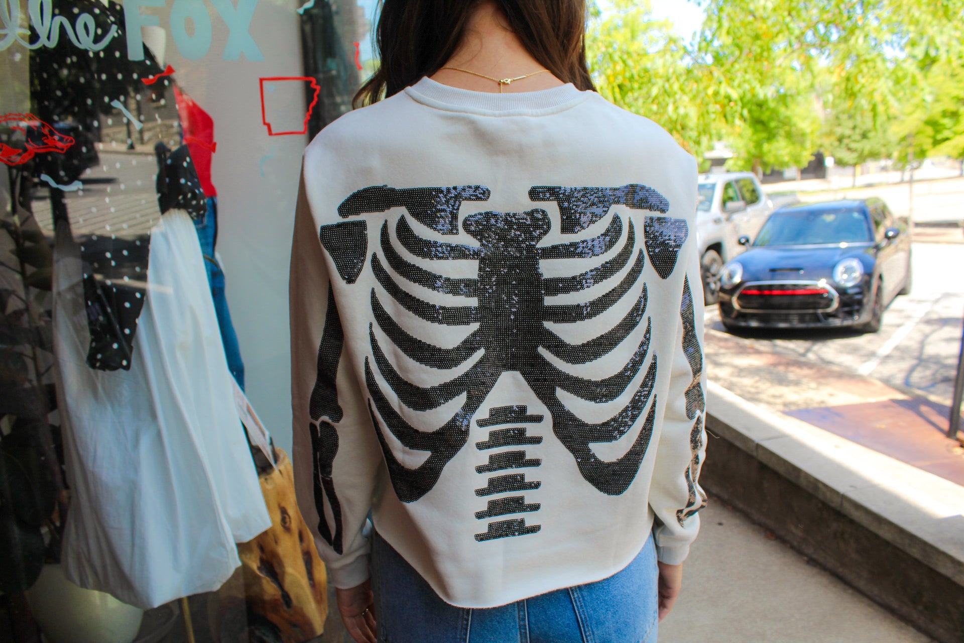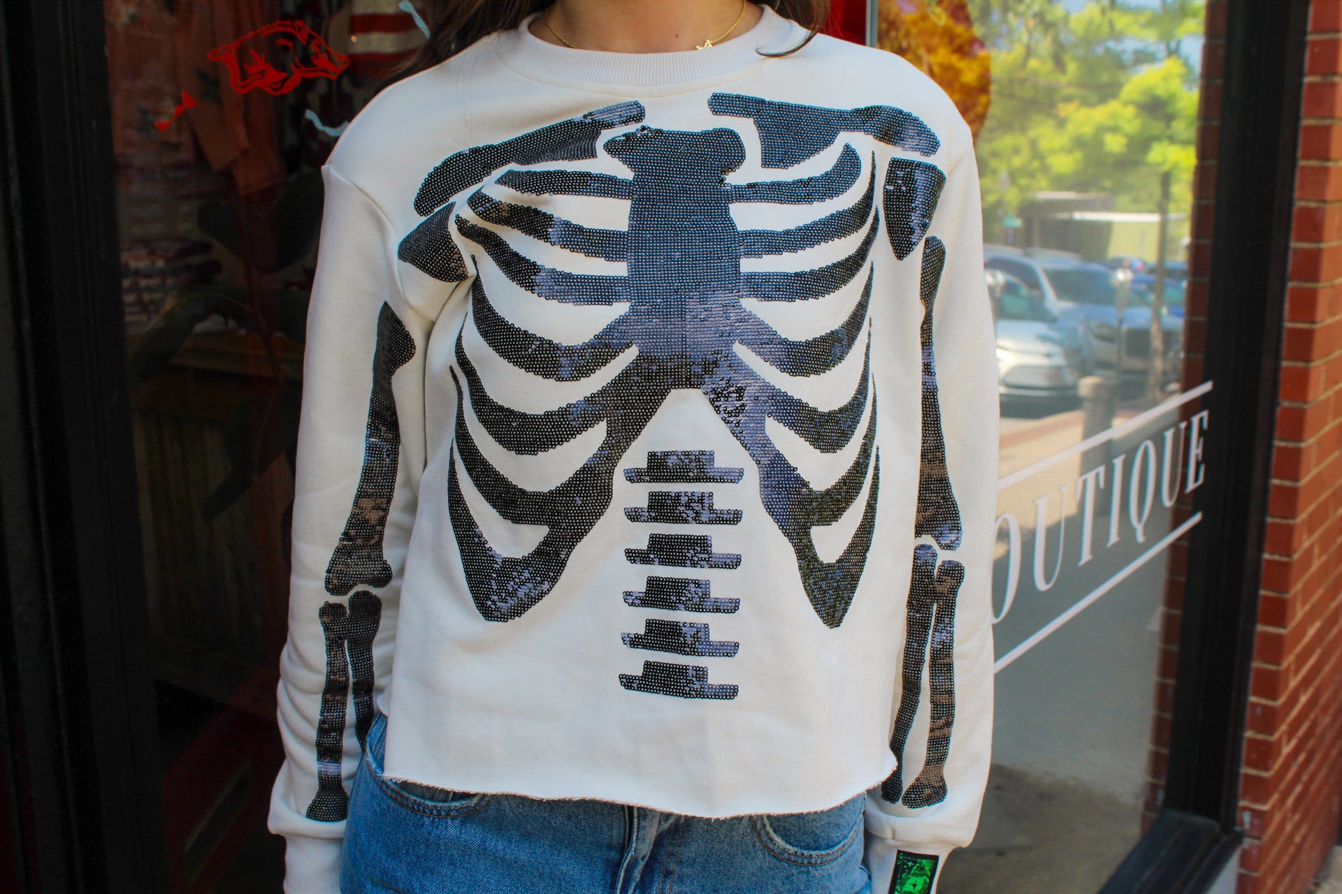 Show off your spooky side with the Queen Of Sparkles Skeleton Sweatshirt. Ideal for Halloween fun or crisp autumn days, it keeps you warm and festive all season long! This sweatshirt features a crew neckline, and raw edge hemline. Black sequins make up the skeleton design on front, back and arms.