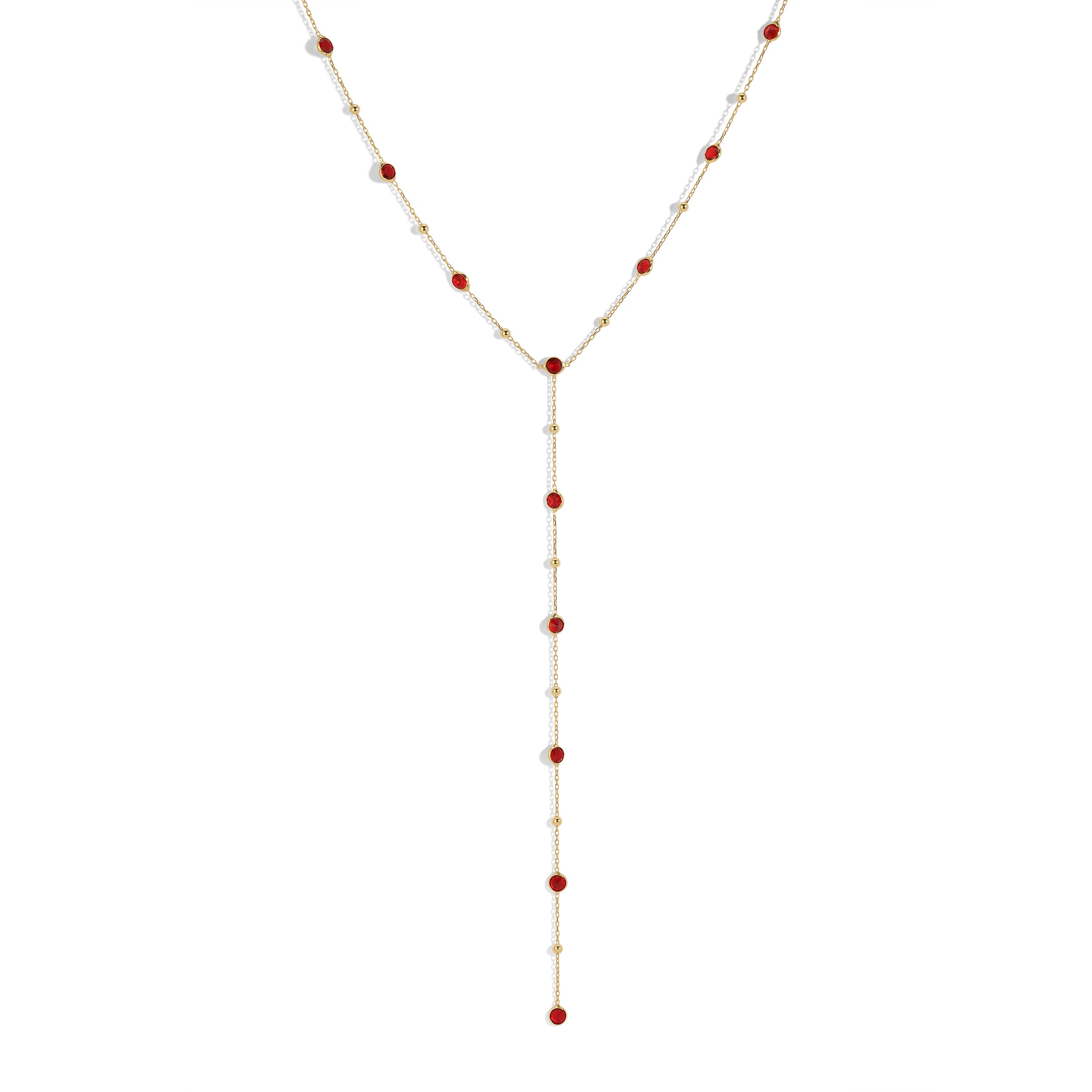 Turn up the passion with the ruby bezel gemstone lariat necklace. Dazzling red stones line a delicate gold chain, creating a vibrant statement of strength and love. Its slender Y-shape adds a feminine finish, making it perfect for both everyday glam and special nights out. A bold yet romantic necklace that commands attention.