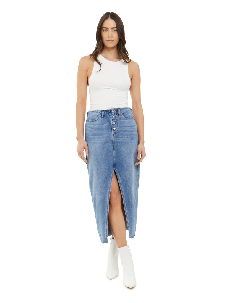 Indulge in this denim skirt, a sophisticated midi length with a daring front slit. The perfect combination of casual and chic, it flatters your figure and adds a touch of playful elegance to any outfit. Treat yourself to this must-have for your wardrobe, and elevate your style.