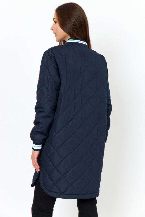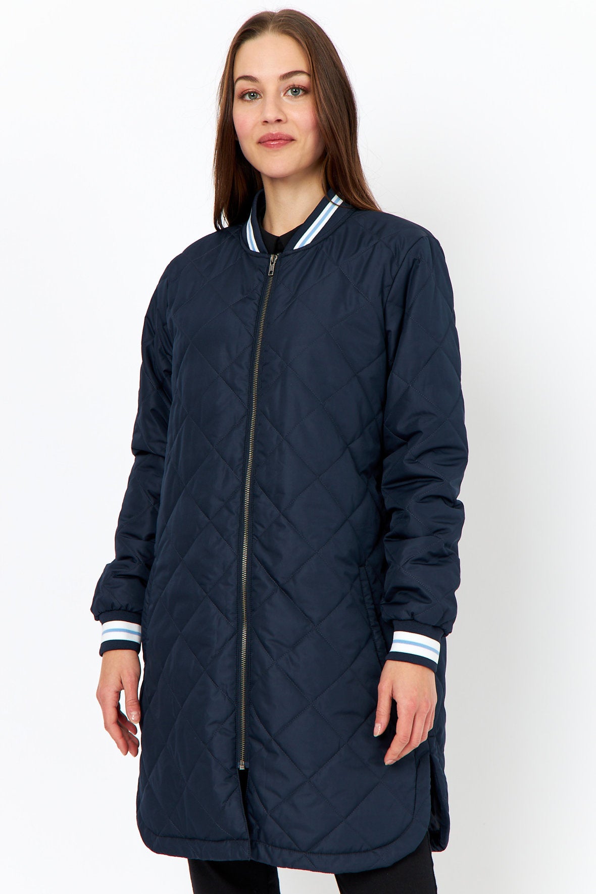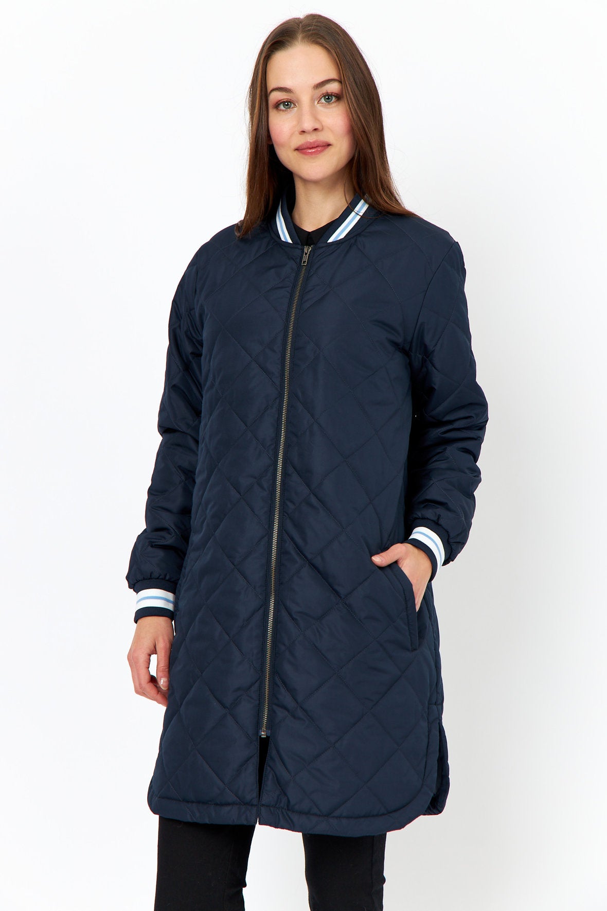 This jacket is sporty with stripes on the cuffs and a border at the neck. It is quilted with a polyester lining. The pattern is squares on point. It has a zipper and pockets. With a really nice length that requires a small slit in the side. It has a loose cut. It stops the wind and also takes light precipitation.