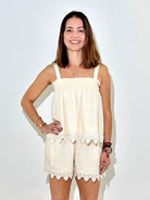 Lightweight cream shorts designed with a relaxed fit and finished with a scalloped lace hem for a soft, feminine touch. Comfortable and breathable with an easy silhouette that pairs perfectly with the matching top or your favorite summer tee. Ideal for casual days, lounging, or vacation wear.