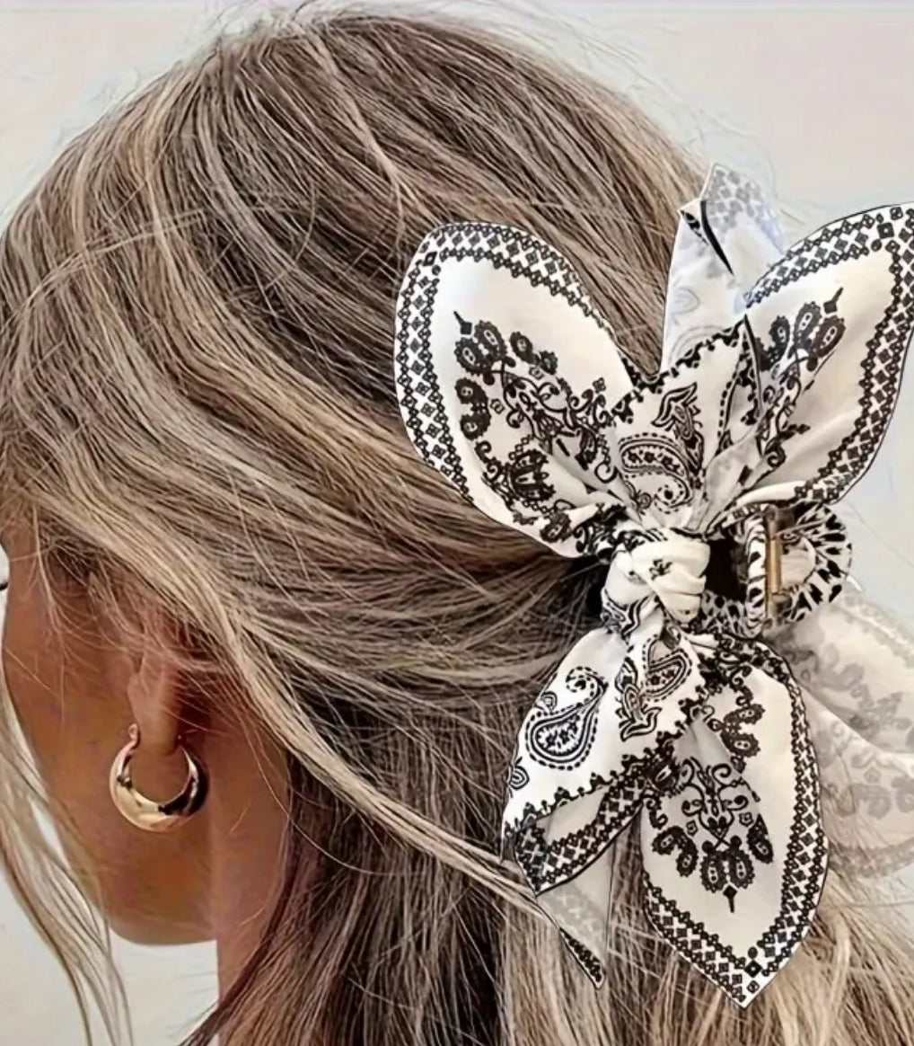 White and black paisley print fabric on oversized hair claw clip.