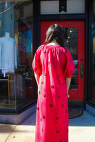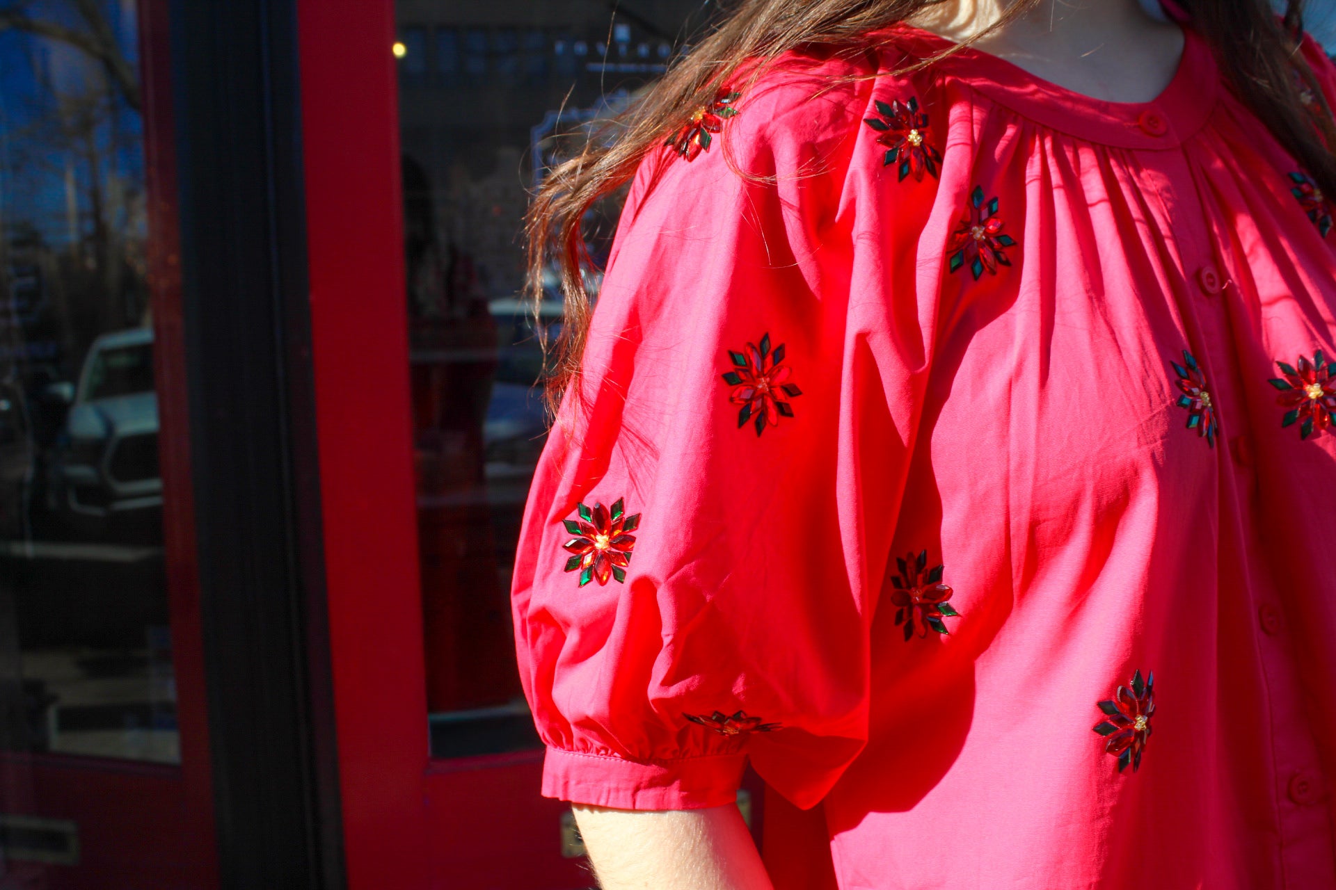 *Slight imperfections are the reason for initial discount. Get in the holiday spirit with this new Queen of Sparkles Poinsettia Dress! This stunning midi features vibrant red scattered jeweled poinsettias, creating a festive and eye-catching look. Made with a button-up design, it's both comfortable and elegant. Elevate your holiday style with this must-have piece!