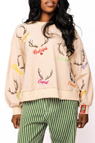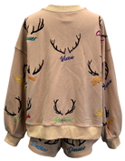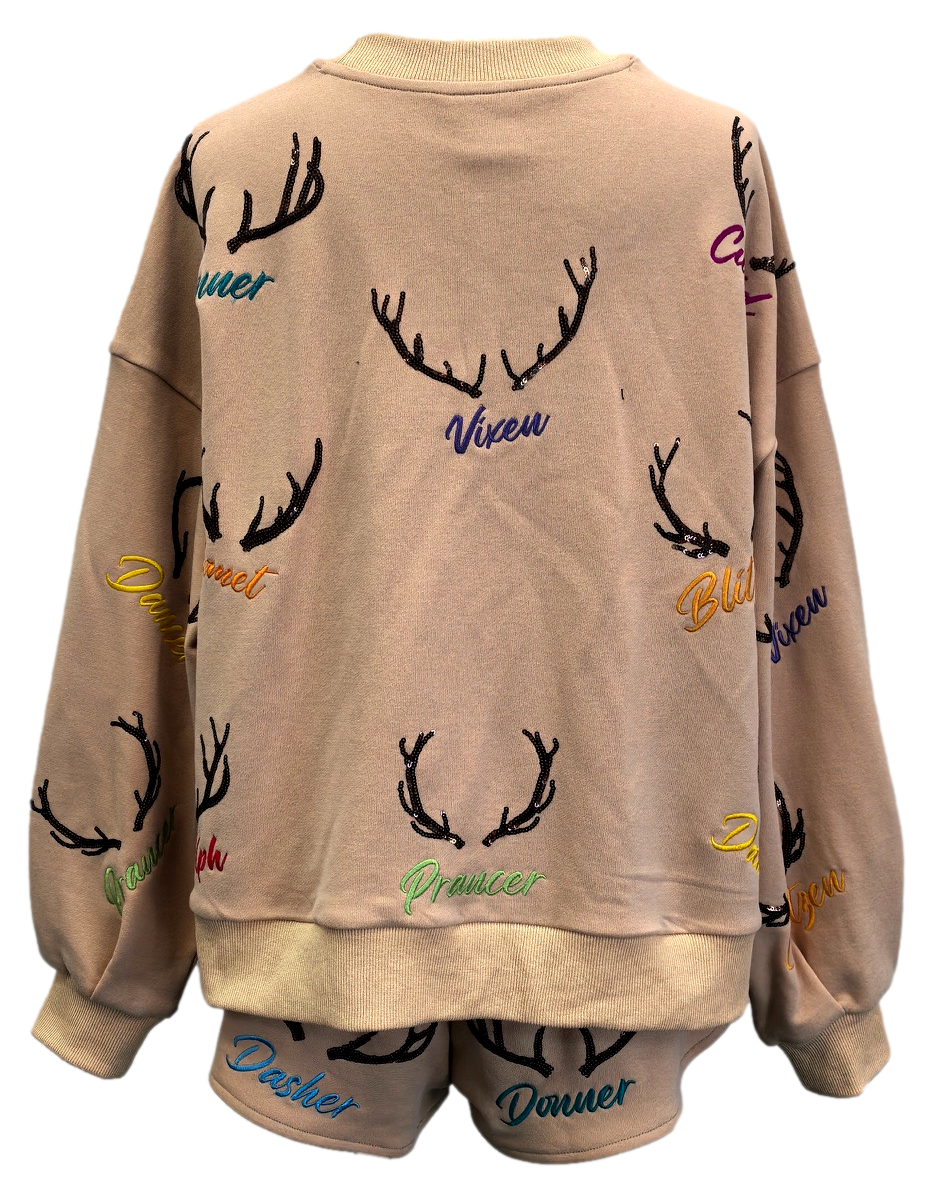 Tan reindeers sweatshirt with all 9 reindeer names on them including Rudolph's red nose!