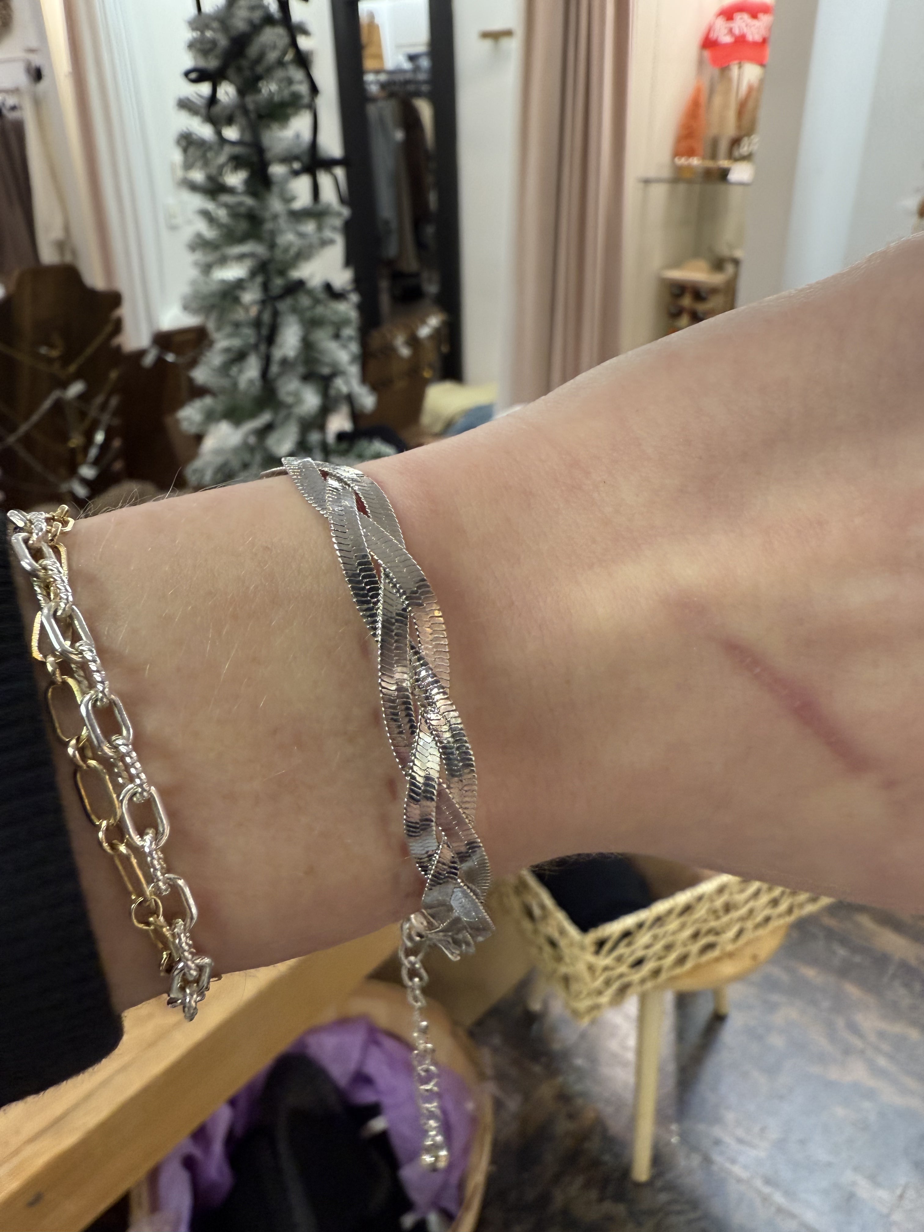 This silver snake bracelet adds a touch of elegance and sophistication to any outfit. The intricate design captures the beauty of a slithering snake, making it a unique and eye-catching accessory.
