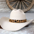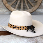 The Pebbles hat band is a stylish leather accessory featuring tan, hair-on cowhide, with dark brown spots. It measures 22.5" long and 1" wide. Adjustable leather ties ensure a perfect fit for almost any hat.