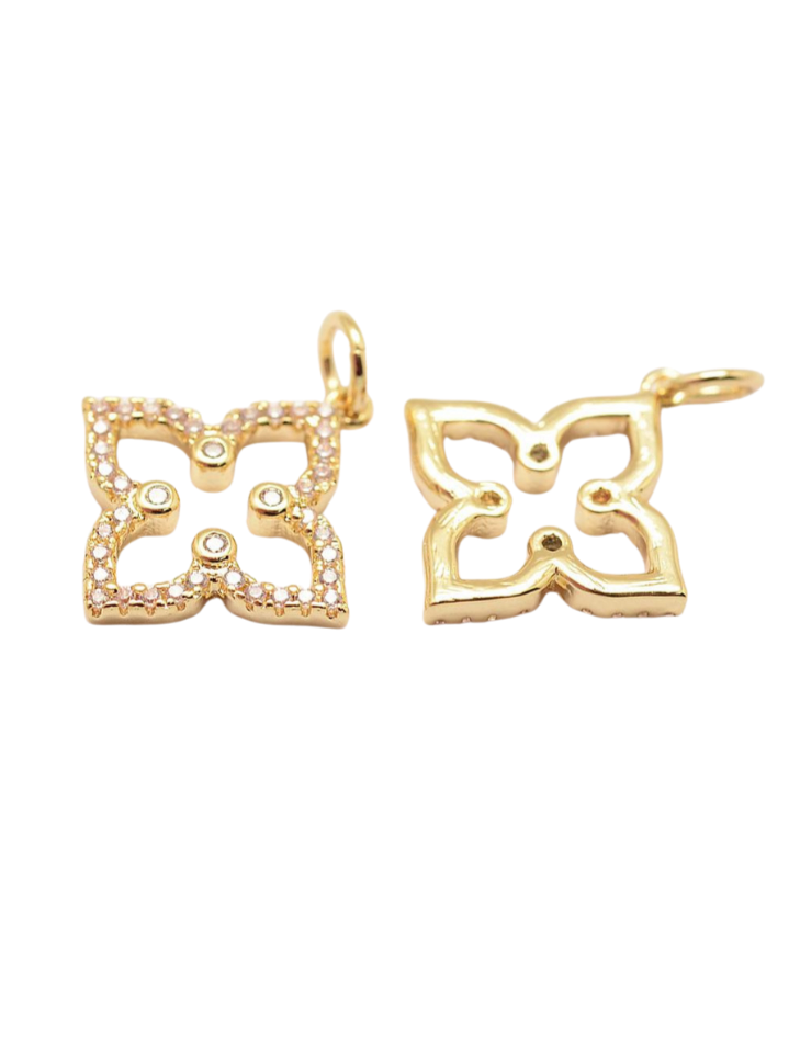Expertly crafted with dainty details, this Gold Pave 4-Point Flower Charm adds a touch of elegance to any jewelry collection. The intricate pave design sparkles beautifully and effortlessly adds a touch of sparkle to any outfit.